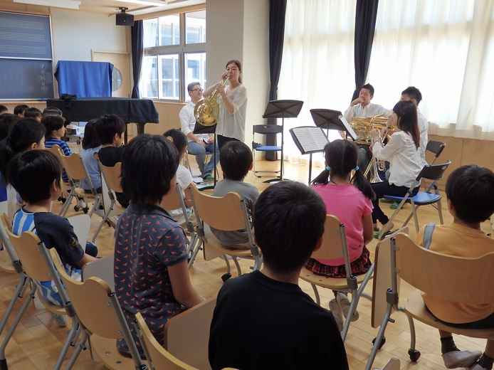 G線上のアリア(J.S.バッハ)の演奏後、楽器紹介を交えた演奏が続きます。ホルンについては、約7割の児童が知っていました。唇の振動が、マウスピースや楽器に伝わり音が出るという説明を受けた子ども達は、意外そうな表情を浮かべていました。