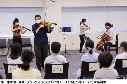 ■内 容 アウトリーチについて学び、講師と弦楽四重奏を組み、小学生を対象としたプログラムを受講生同士で考え、第一生命ホールオープンハウスで発表(小学生対象・約30分間のプログラム)。 *上記の他、2022年5月~2023年3月の期間、打合せ・リハーサル・小学校でのアウトリーチの実践・第一生命ホールロビーコンサート出演等あり。 |