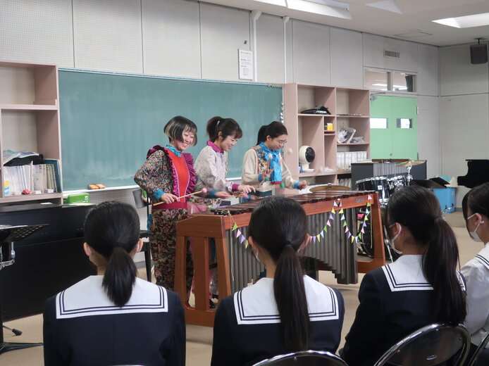 ■二曲目「剣の舞」の紹介をした時には、生徒たちもこの曲を知っていたようで、始まる前に生徒同士で話していました。とても速いテンポのマリンバにドラムも加わり、ドラマチックに終わりました。演奏中は、マリンバを打つ速さに生徒たちがずっと注目していました。