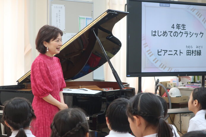 演奏が始まる前の音楽室には、どこかそわそわした空気が漂っていました。いつもと違う椅子の配置に加え、演奏家が来るという特別感からか、子どもたちは友達の様子をうかがったり、周囲を見回したりしていました。そんな中、田村さんが演奏を始めると、空気が一変しました。「きらきら星だ!」という声があちこちから上がり、子どもたちは一気に音楽の世界に引き込まれていきました。鍵盤をじっと見つめたり、スクリーンに見入ったり、友達と顔を見合わせながら喜びを分かち合ったりと、多様な反応が生まれていました。曲が終わるころには自然と大きな拍手が起こり、多くの子どもたちが笑顔を浮かべていたのが印象的でした。田村さんはそうした反応を丁寧に拾いながら進行し、音楽を介した穏やかな対話が早い段階で生まれていたように感じました。